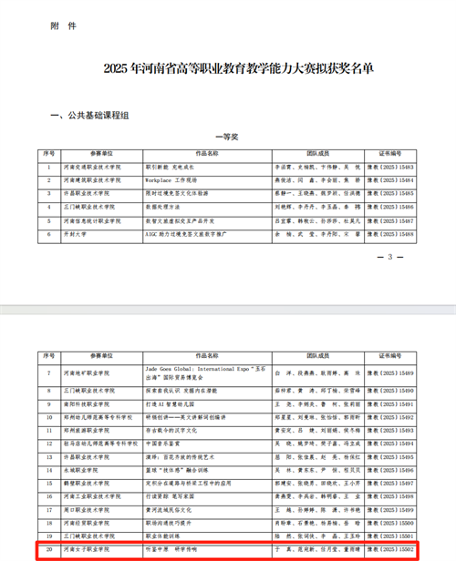 8月2日河南省教育厅办公室公布2025年河南省高等职业教育教学能力大赛获奖名单,我校成绩优异,共荣获一等奖一项、二等奖两项、三等奖一项。