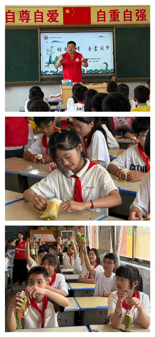 同时,另一组党员志愿者到亢村镇夹河学校,深入班级讲授传统文化。从“端午节”的起源讲起,着重阐释了伟大爱国诗人屈原心系家国、坚守节操的崇高精神,深刻剖析了节日背后的爱国主义精神,厚植家国情怀。党员们还带领同学们进行香囊制作。孩子们自己动手制作出饱满漂亮的香囊,他们纯真的笑脸、专注的神情形成了最温暖的风景线。