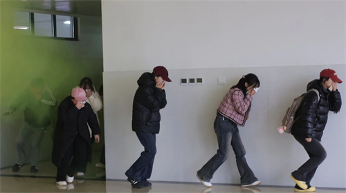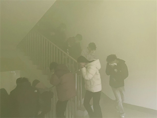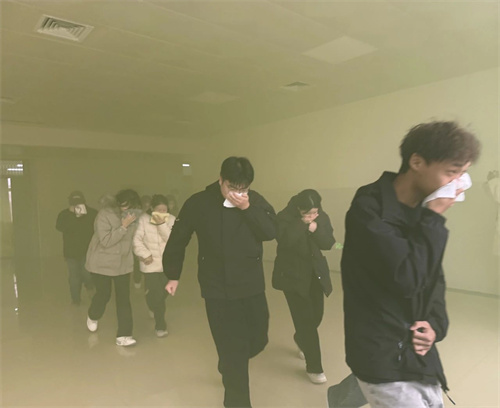 随着一阵急促的警报声在教学楼内响起,烟雾弹弥漫整个楼道,全员师生遵循“快速高效、有序疏散”原则,按照预定的疏散方案,用湿毛巾捂住口鼻,低姿弯腰,沿着指定的疏散路线,快速而有序地向安全区域撤离。
