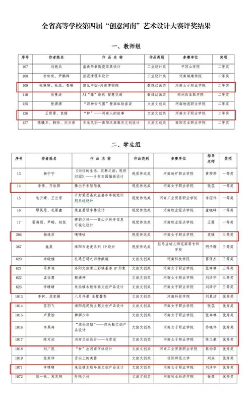 近日,河南省教育厅公布全省高等学校第四届“创意河南”艺术设计大赛结果。美术与设计学院师生在3363件/套参赛作品中脱颖而出,斩获12项荣誉,包括一等奖1项、二等奖2项、三等奖4项和优秀奖5项。这是我校注重艺术创新与实践、艺术设计教育成果的重要体现。