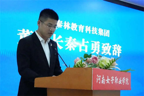 河南秦林教育科技集团董事长秦占勇对学校的信任与支持表示诚挚感谢。他简要介绍了集团的基本情况、院校联合培养模式及培养体系的优势,并表示,双方将在理念共识共知的基础上,同向发力、优势叠加,充分发挥企业和学校在资源、服务、技术、人才等方面的互补优势,促进职业教育与企业发展良性互动。