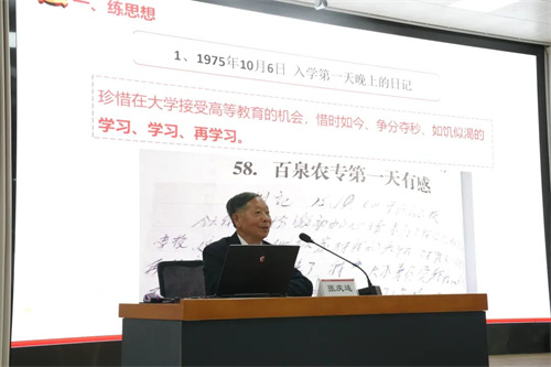 讲座中,张庆连通过“回顾日记”的形式,从“练思想”“学理论”“记初心”三个方面,为大家分享了求学、工作及退休至今的人生经历与心得感悟,立体呈现了跨越半个世纪的知行合一之路。从开荒种志气田、学雷锋、学毛泽东选集,到冒雪剪果树、撰写100余万字的心得笔记,被选派河南省农林科学院进修,全年无休投身科研,发表论文,出版书籍,建起了中国第一个榆树基因库,在祖宅建立生态家园,为乡村振兴和教育下一代服务......他身体力行地贯彻“理论联系实际”这一原则,将自己生动鲜活的故事转化为一行行脍炙人口的金句,“人民送我上大学,我上大学为人民。进学校不忘农村,当学生不忘农民,拿笔头不忘锄头。”引得在场学生频频点头、掌声阵阵。